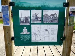Current StatusSite located on the dyke at the end of Steveston Highway. A wooden deck holds a two sided display sign with a detailed explanation of the site including a sketched plan of the post. A round steel plate is located at the approximate position of the #2 gun., unknown function.