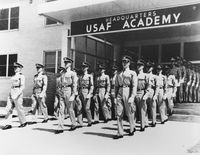 United States Air Force Academy (1954-Active) - The United States Air Force Academy was established in 1954 near Colorado Springs, El Paso County, Colorado. The Academy is a publicly supported four year coeducational service academy offering undergraduate degrees and military officer commissions to graduates. Graduates must complete a service commitment and are commissioned as 2nd Lieutenants or equivalents upon graduation. The majority of students are selected from nominations made by their United States Representative or Senator. Some are nominated by the Vice President or even the President of the United States. All cadets must meet admission requirements and be nominated. OriginsThe site for the academy was selected in 1954 and announced by the Secretary of the Air Force on 24 Jun 1954. During construction, an interim academy was opened at Lowry Air Force Base near Denver. The first class of 306 cadets arrived at Lowry on 11 Jul 1955 and were housed in renovated World War II Barracks. A group of Air Force junior officers who had been educated at other military schools served as upper classmen until the first class could take over that function. The wing of 1,145 cadets moved from Lowry AFB to the new site at Colorado Springs on 29 Aug 1958. The first class (Class of 1959) graduated 207 cadets who were commissioned 2nd lieutenants on 3 Jun 1959.