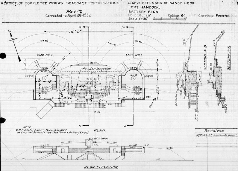 Battery Peck (1903-1943) - Battery Peck was a reinforced concrete, Endicott Period 6 inch coastal gun battery on Fort Hancock (2), New Jersey. The battery was named in G.O. 105, 9 Oct 1902, after 1st Lt. Fremont P. Peck (Cullum 3190), Ordnance Department, U.S. Army, who was accidentally killed 10 Feb 1895, by the bursting of a gun at Sandy Hook Proving Ground, New Jersey. Battery construction started in 1901, was completed in 1903 and transferred to the Coast Artillery for use 10 Nov 1903 at a cost of $ 33,940.25. Deactivated in 1943. Endicott PeriodPart of the Harbor Defense of Southern New York. Originally built as an Endicott Period concrete coastal gun battery with two 6" M1900 guns mounted on M1900 Barbette carriages. This was a two story battery with the guns on the upper level and a common magazine on the lower level. Two hand powered Hodges shell hoists lifted the ammunition from the lower level to the gun loading platform. The shell hoists were transferred for use on 10 Nov 1903.