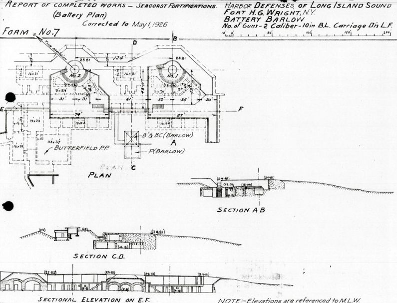 Battery Barlow (2) (1901-1943) - Battery Barlow (2) was a reinforced concrete, Endicott Period 10‑inch coastal gun battery on Fort H.G. Wright, Fishers Island, Suffolk County, New York. The battery was named in G.O. 30, 19 Mar 1902, after MG Francis C. Barlow, U.S. Volunteers, who distinguished himself in the battle of Spottsylvania, 9 May 1864, during the U.S. Civil War, and who died on 11 Jan 1896. Battery construction started in December 1898, was completed in the Fall of 1900 and transferred to the Coast Artillery for use 7 Mar 1901 at a cost of $ 110,000.00. Deactivated in 1943. Endicott PeriodPart of the Harbor Defense of Long Island Sound. Originally built as an Endicott Period concrete coastal gun battery with two 10" M1895 guns mounted on M1896 Disappearing carriages. This was a two story battery with the guns on the upper level and the magazines below. Shells were moved from the magazine level to the gun loading platform originally by two electric Hodges back delivery shell hoists. These hoists were replaced in 1915 by two Taylor-Raymond back delivery shell hoists that were accepted for service on 6 Aug 1915. Electric power was furnished by the Battery Butterfield emplacement power plant. The original set of 10" M1895 guns was swapped out in 1914 for a set of M1888II guns. In 1914 a BC station and plotting room were built in the rear of Battery Barlow and accepted for service on 27 Mar 1914.