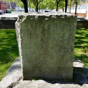 Fort Schuyler (5) (1758-1760) - A colonial French & Indian War Fort established in 1758 near Utica, Oneida County, New York. Named Fort Schuyler after Colonel Peter Schuyler of New Jersey. Abandoned as a fortification in 1760. Also known as Fort Desolation and Old Fort Schuyler. History of Fort Schuyler (5)Established in 1758 as small timber and earthworks fortification toward the end of the French & Indian War in present day Utica, New York. Abandoned as a fortification in 1760 but may have been used intermittently during the Revolutionary War and known then as Fort Desolation. On 6 Aug 1777 the wounded General Herkimer was brought to Fort Schuyler after the Battle of Oriskany. The wounded were put into boats and sent down the Mohawk River to Fort Herkimer. Current StatusTwo monument stones and one wall mounted marker are located in Bagg Commemorative Park in Utica.
