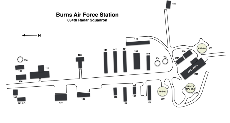 Physical PlantThe physical plant of the site was divided into an upper main site, a lower housing area and a radio site. The upper main site housed the operations building, the radar towers, the enlisted barracks, the bachelor officer's quarters, the orderly room, the chow hall, the motor pool and the backup generators. Apart from the main site just outside the town of Burns was a small housing area for critical married personnel. A separate radio site housed the radio equipment for directing aircraft intercepts.