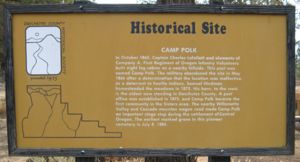 Camp Polk (1) (1865-1866) - Established 28 Sep 1865 by Captain Charles La Follette and troops from Company A, 1st Oregon Infantry Volunteers and named for Polk County, Oregon. Abandoned 24 May 1866. HistoryCamp Polk was established in Sep 1865 to protect the Santiam Wagon Road (Willamette Valley and Cascade Mountain Wagon Road) from Eastern Oregon to the Willamette Valley from hostile Indians. No attacks occurred and the fort was abandoned in May of 1866. Current StatusNothing remains of the camp but the general location is marked by an interpretive kiosk that explains the history of the Camp Polk Meadow and by a sign that explains the history of Camp Polk itself. The Camp Polk Cemetery is nearby but the earliest markers are from the 1880s and it would seem that the cemetery served the community of Camp Polk rather than the camp itself.