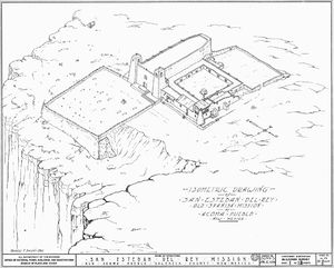 [[File:Mission Acoma | [[File:Mission Acoma Drawing (1).jpg|thumb|right|300px|Mission Drawing HABS]] | ||