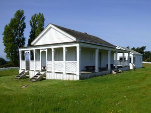 Part of the San Juan Island National Historic Park administered by the National Park Service. One officers quarters, an original building moved back to the camp from town and one laundress quarters are the only remaining buildings. On a hill above the camp is the earthen outline of a protective redoubt built under the supervision of Superintending Engineer Lt. Henry M. Robert (Cullum 1763) (of Robert's Rules of Order).