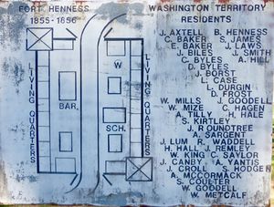 Fort Henness was built as a large stockade with two blockhouses on opposing corners enclosed by buildings that included a school for the children. The fort was reportedly occupied for 16 months by 224 people of 30 families during the emergency period of the [[Washington Indian War|Washington Indian Wars]]. Abandoned as a fortification about 1856. | Fort Henness was built as a large stockade with two blockhouses on opposing corners enclosed by buildings that included a school for the children. The fort was reportedly occupied for 16 months by 224 people of 30 families during the emergency period of the [[Washington Indian War|Washington Indian Wars]]. Abandoned as a fortification about 1856. | ||