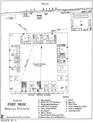 Fort Shaw (1867-1891) - Established in 1867 as Camp Reynolds by Major William Clinton and four companies of the 13th U.S. Infantry. Renamed Fort Shaw 1 Aug 1867 after Colonel Robert G. Shaw, 54th Massachusetts Infantry, who was killed before Fort Wagner (1) in 1863 during the U.S. Civil War. Abandoned in 1891.
