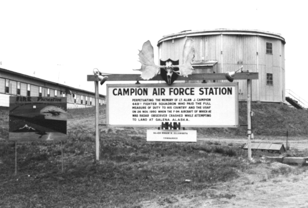 Campion AFS Dedication Sign Commemorating Lt. Allen J. Campion (Major Roger W. Ellsworth Cmdr), public domain, Source: 11 AF archives, History of the Aircraft Control and Warning System in Alaska: Air Defense of Arctic Skies, Argonne National Laboratory, Illinois, 2002 updated 2013, 140 pages, Pdf, page 41