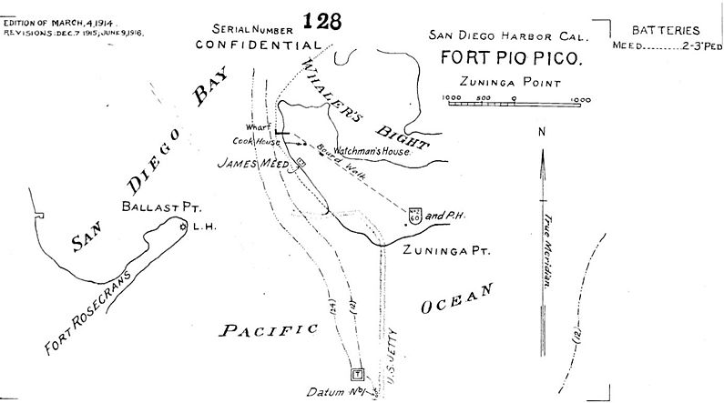 Fort Pio Pico (1901-1919) - An Endicott Period Coastal Fort first established as a sub post of Fort Rosecrans in 1901 on North Coronado Island Military Reservation, San Diego County, California. Named Fort Pio Pico in G.O. 20, 25 Jan 1906, after Pio Pico, Governor of California under Mexican rule. Abandoned in 1919 and turned over to the Navy in 1935.