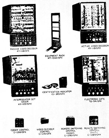 Radar Identification Set GPX-7A operates with an airborne transponder identification set. Any of 32 security identity (SI) codes, 400 personnel identity (PI) codes, or 6,1 traffic identity (TI) modes, provide identification friend or foe (IFF) and selective identification feature (SIF) for Radar Sets FPS-3 or FPS-3A. Two interrogators of the GPX-7A alternately transmit coded rf pulses to trigger the airborne transponder identification set and convert the received transponder reply to video pulses. The equipment permits the video pulses to be displayed on the plan position indicators of the associated radar set or supplies the video pulses a the SIF Coder-Decoder. The GPX-7A supplies coded pulses for security identity, personnel identity, and traffic identity. The set decodes multiple-pulse response codes transmitted by airborne equipment in reply to interrogations or challenges and supplies the video reply signals to the indicators of the associated radar. The interrogator output level and receiver sensitivity are adequate for interrogating and receiving replies from transponders operating within the detection range of the associated radar. The AN/GPX-7A may be independently operated to track targets equipped with a radar identification set.