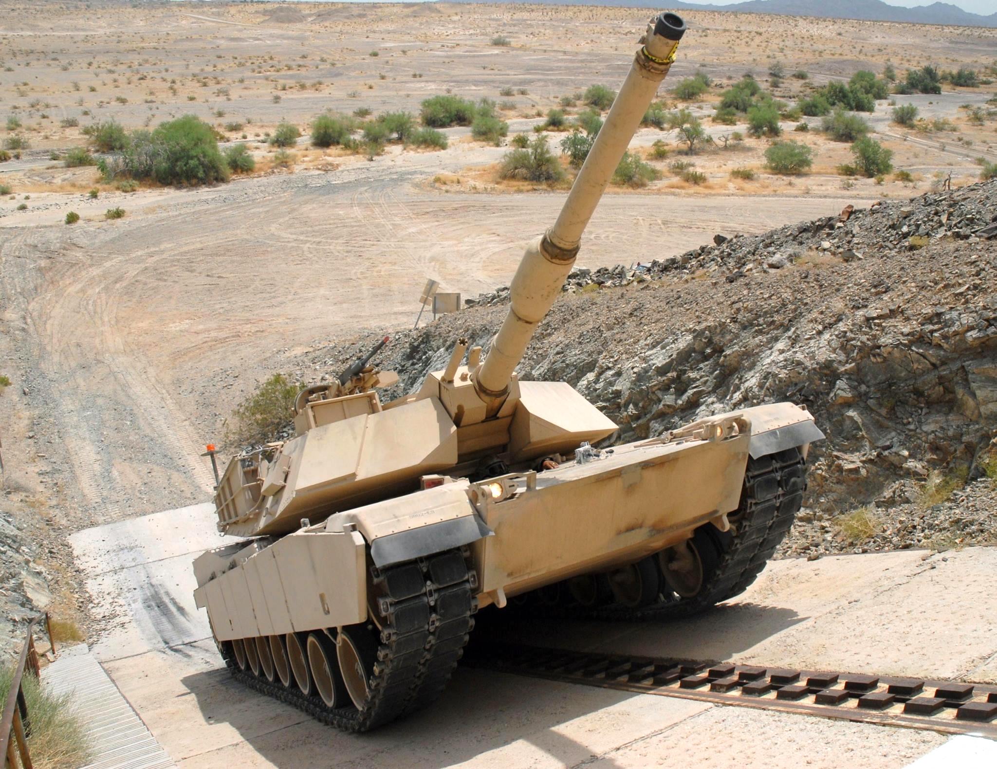 A U.S. Army M1 Abrams tank climbs a 60° incline, part of performance testing at the YTC., Photo by Mark Schauer (U.S. Army) or Mark Holloway (U.S. Army) (both Army employees claim credit for the photo) - Wikimedia Commons