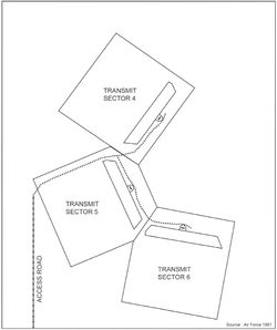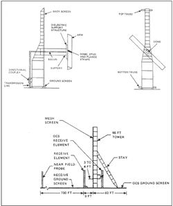 Transmitter Buildings There are three transmitter buildings, one in each sector. Sectors 5 and 6 have identical buildings 235 feet in length by 60 feet in width, while the sector four building has an extension on the northeast side that adds 30 feet to the width for a length of some 108 Feet. This adds an additional 1110 square feet to the sector 4 transmitter building. There is also a "cattle chute" type paved entrance to the extension area indicating that this area served as a primary access point and probably contained administrative, security, and possibly communications facilities that served the whole site. All three of the transmitter buildings are pre-engineered steel structures with insulated, corrugated steel walls and insulated, corrugated steel, gabled roofs, on a concrete foundation. There is a horizontal row of air intake and exhaust grills that span 3/4 of the building's length just below the roofline. The buildings contain no windows, with ventilation provided via the louvered vents and an air-conditioning system. From the photographs above the individual transmitter cabinets and the power tubes atop them appear to be water-cooled hence the large water tank by each building. {Clr}} Water Tank Wells Transmitter Antenna Arrays Sounder Antenna Array Power Substation Garage Communications Terminal