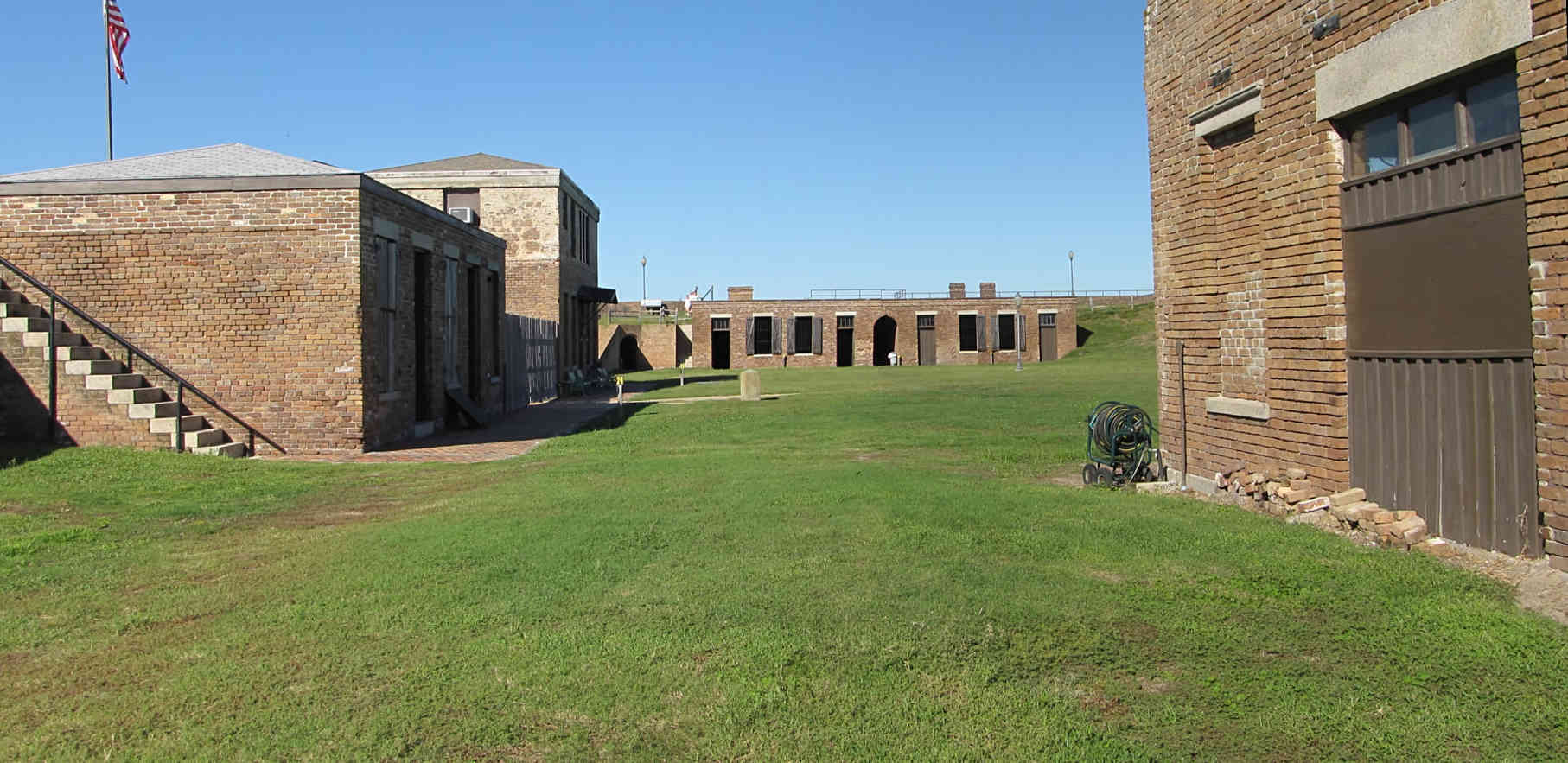 Looking across north end of the parade grounds from beside Officer quarters, to the left is the old Commandants quarters and the Guardhouse. on the far side is the old bakery and blacksmith shops