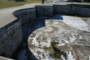 In 1937-38 the 12" gun emplacements in Battery Caswell were sealed and walls built along the open back side of the gun platform to totally enclose the gun platform. These enclosed areas became swimming pools filled with 92 degree mineral water from artesian wells that had been drilled and abandoned 30 years earlier. This was a part of the attempt to make the abandoned fort property into a resort property and the mineral hot springs became quite popular. These pools were in use as late as 1968.