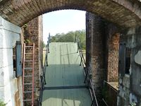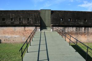 The Advanced Redoubt is trapezoid with two long unequal sides with the shortest side toward the landward direction of attack. The Redoubt has a dry moat with a drawbridge to the entrance, but unlike Barrancas the moat completely surrounds the fort. The redoubt was designed to make a landward assault by foot soldiers as costly as possible. The outer walls of the moat feature rifle ports that would create a deadly crossfire and the ramparts mounted fifteen guns.