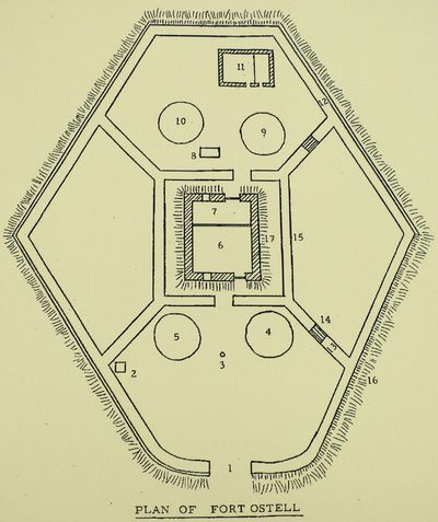 Fort Ostell was built in May 1885 around a former Hudson's Bay Company post that had been looted. Captain Ostell and his men constructed the post as a six sided defense with the HBC building at the center. The Captain and his men were housed in four tents, two at each end of the building. The interior of the post had a series of canals with movable bridges across them. The whole post was surrounded with an abbatis (sharpened poles facing the enemy).
