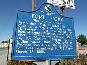 Fort Cobb (1859-1862) (1868-1869) - First established in 1859 by Major William H. Emory (Cullum 642), 1st U.S. Infantry, in Caddo County, Oklahoma. Named for Howell Cobb, Speaker of the U.S. House of Representatives (1849-1851) and U.S. Secretary of the Treasury (1857-1860). The post was abandoned in 1861 at the beginning of the U.S. Civil War and occupied by Confederate forces until they were overrun by hostile Indians. The post was re-garrisoned after the war 1868 but was finally abandoned in 1869.